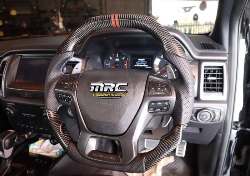 งานปั้นติ่งพักมือ ตัดบน-ล่าง ขึ้นลายด้วยเคฟล่าคาร์บอนแท้ เย็บหนังแท้รู หนังดำด้ายฟ้า จับสบายมือในยามขับขี่ ดีไซด์สสยาไตล์รถสปอร์ต